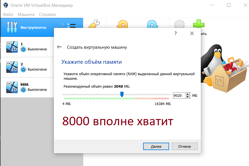 2. Обязательно, чтобы на основной ОС у нас было не менее 8гб оперативки. На виртуалке выбираем также 8